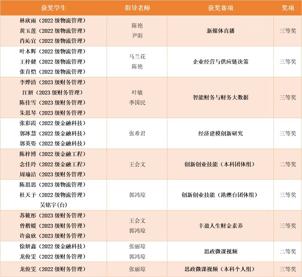 在各位老师的悉心指导下,参赛同学以饱满的热情和不懈的努力不断锤炼技术以此提高技能水平。每一次的挑战都有成长,每一次的尝试都有收获。最终,在这场汇集两岸群英,尽显竞技风采的舞台上,福州大学至诚学院经济管理系参赛学子经过激烈的竞争,凭借优秀的表现在大赛的七个领域中,共有2个队伍斩获二等奖,6支队伍斩获三等奖。在这些熠熠生辉的荣誉背后,是每一位参赛学子对职业技能的不懈追求和对完美的执着渴望,更是所有指导老师对对学生未来的深切期望和对教育事业无限热爱的最好证明。