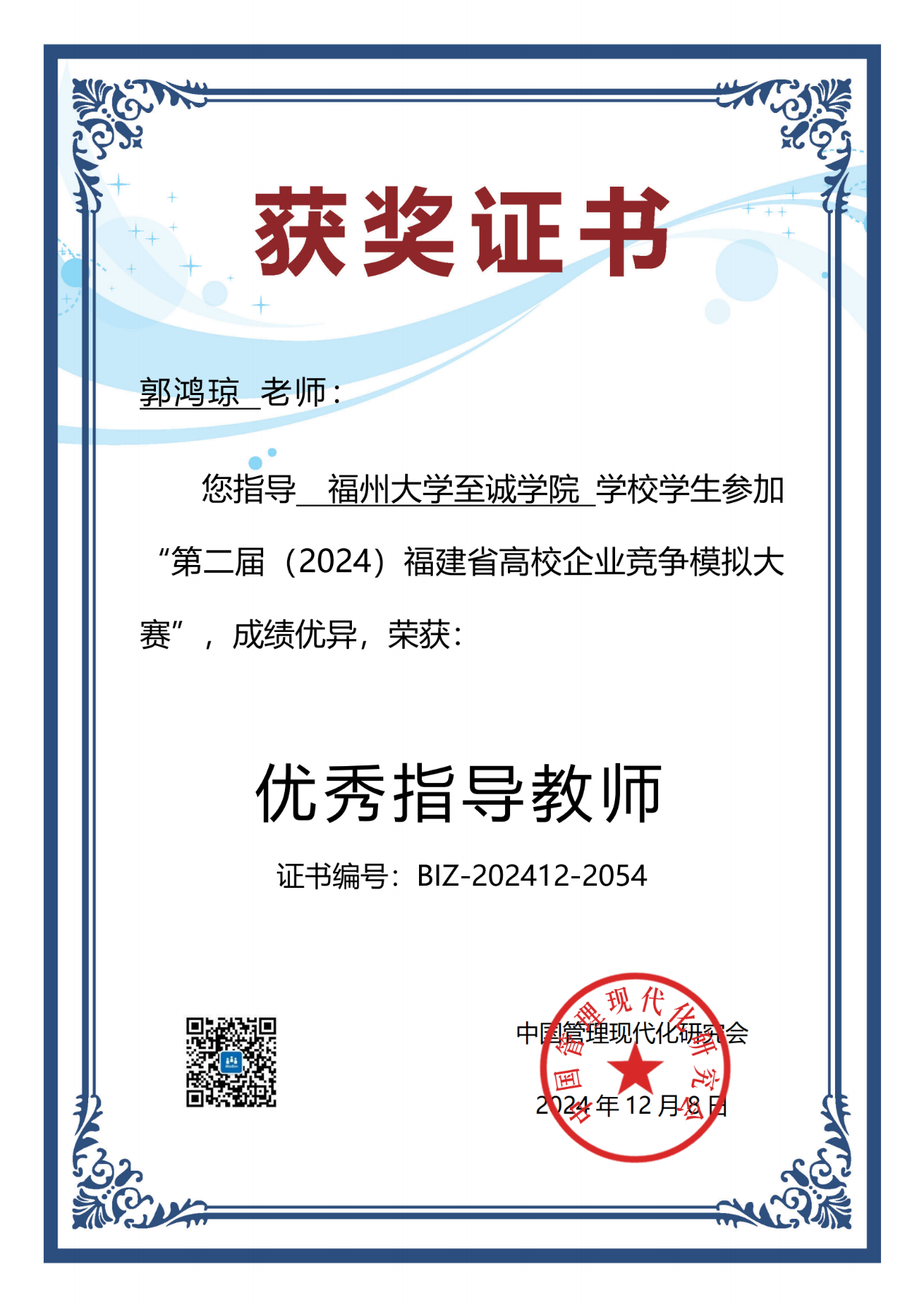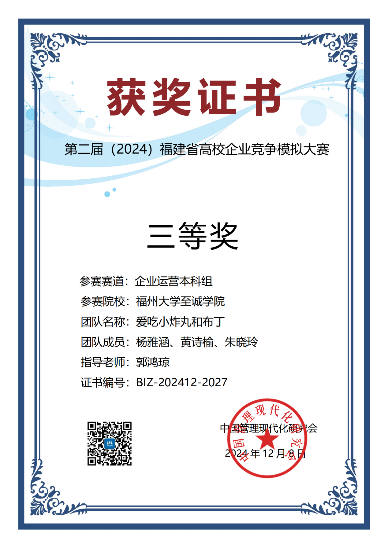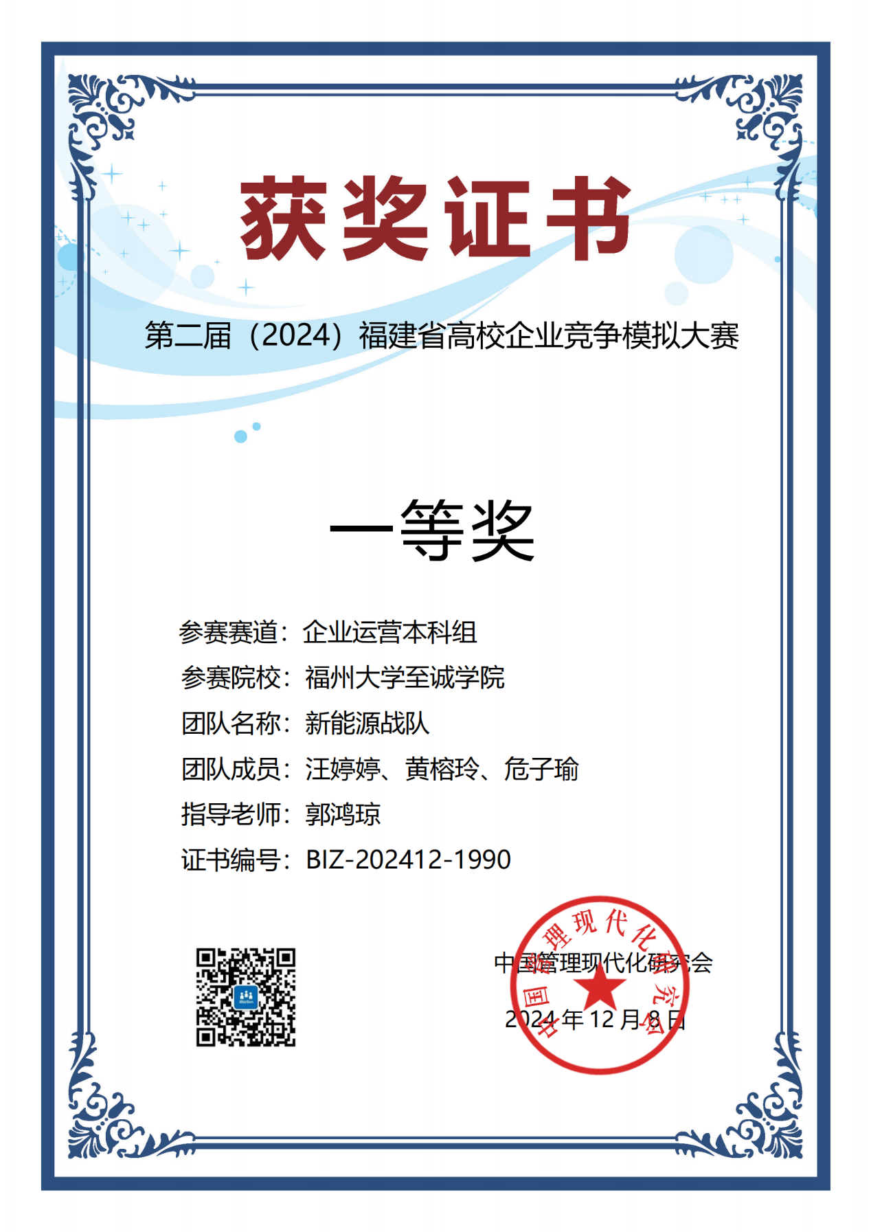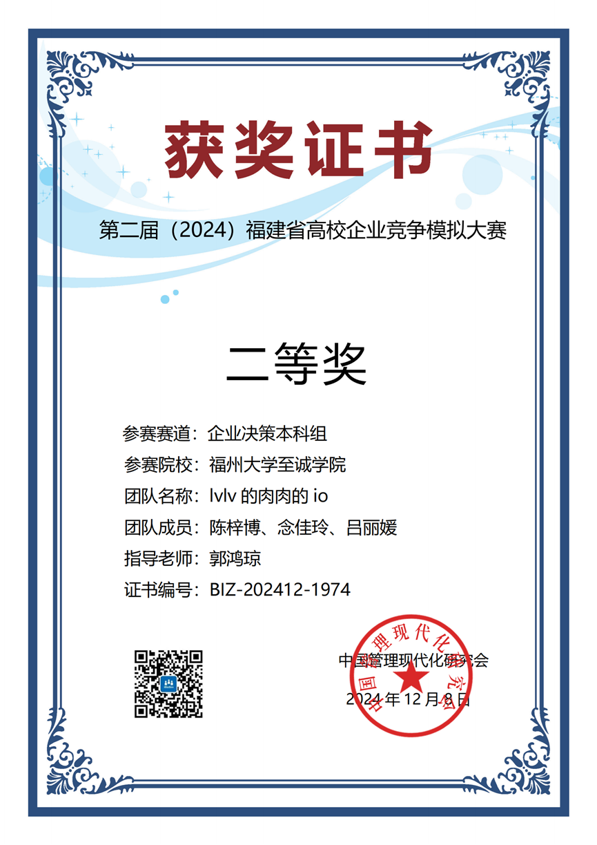 在经济管理系师生的共同努力下,由王婷婷(2022级财务管理)、陈梓博(2022级金融工程)等同学组成的10支福州大学至诚学院代表队,在郭鸿琼老师带领下,经过激烈角逐,荣获企业运营本科组