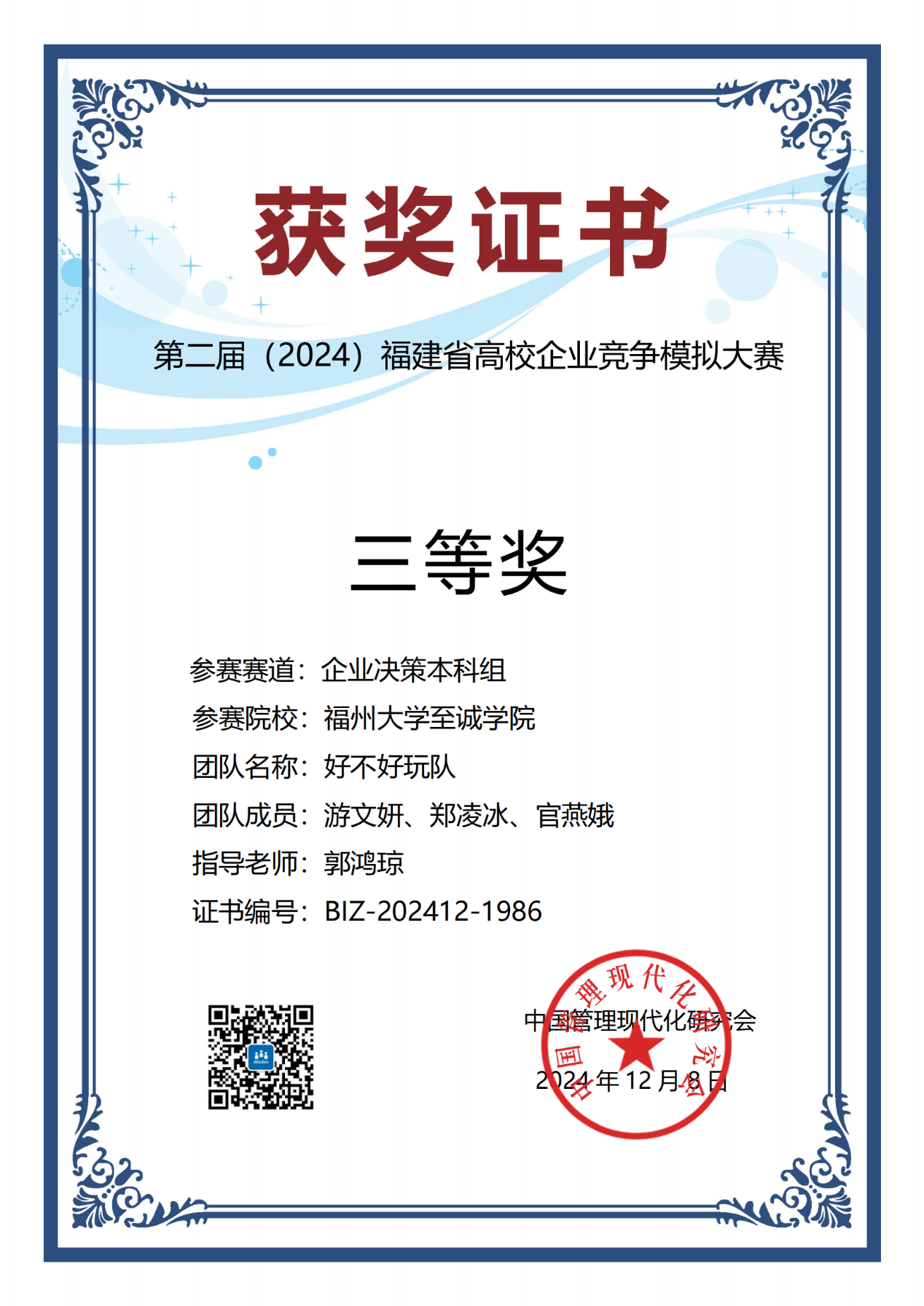 省赛三等奖1项的佳绩。据悉,本届大赛共有福建省内22所院校157支队伍报名参加复赛,其中企业决策赛道10所院校54支队伍、企业运营赛道(本科组)13所院校84支队伍、企业运营赛道(高职组)6所院校19支队伍。自1983年创办,2010年推广到普通高校以来,比赛成果在社会上受到广泛认可并于2023年新增列入中国高等教育学会发布的《2023全国普通高校大学生竞赛分析报告》竞赛目录序号73。我们在此向本次获奖的同学表示诚挚的祝贺,向辛勤工作的老师致以崇高的敬意!本次优秀成绩的取得是对经济管理系师生共同努力的肯定也是对未来的无限期许。愿他们在未来的时间里继续以满腔的热情和不懈的努力,书写更加辉煌的篇章。