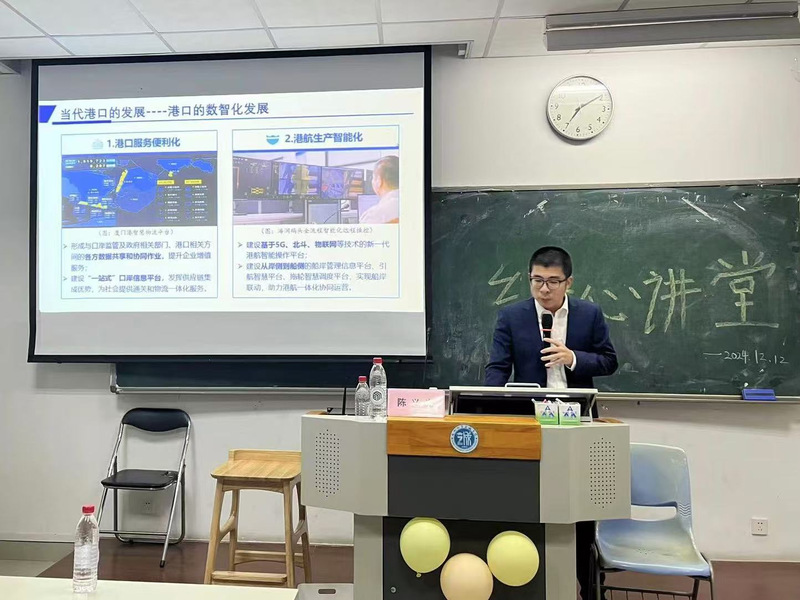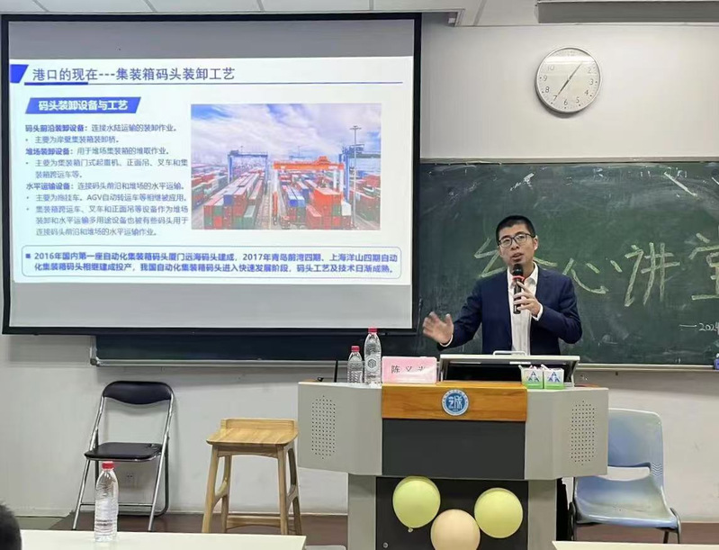 讲座伊始,陈义光老师向大家展示了旧社会码头工人的照片和当代新港口运作情况的照片,把两组照片的鲜明对比与自身的工作经历相结合,以生动的实例将当代港口的发展现状和未来展望娓娓道来。接着,陈义光老师从福建港口集团、福建港口布局、福建港口组建情况、福建港产城的发展几个方面向大家重点介绍了福建港口目前的发展情况。结合着当代物流行业的发展趋势,陈老师还向大家讲述了港口物流一体化发展及与“一带一路”合作倡议紧密结合的“丝路海运”港航贸一体化,让同学们更加深入地了解当前港口物流的发展状况和发展方向。在讲座的最后,陈义光老师鼓励同学们积极深入基层实践学习,多将自己的想法落到实处,根据自己的兴趣勇敢探索适合自己的职业发展道路。