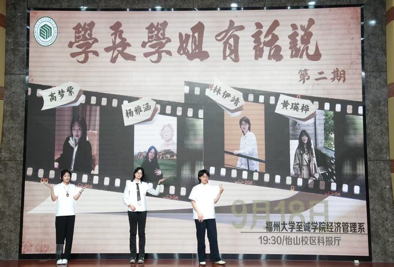 9月18日,福州大学至诚学院经济管理系于学院科报厅开展以“学长学姐有话说”为主题的第二期榜样引领分享活动。本次活动特邀22级经济管理系财务管理专业的杨雅涵和高梦紫、22级财务管理专业林伊靖、23届国际经济与贸易专业毕业生黄瑛桦四位学姐,为2025级新生分享求学与职场经验,助力新生锚定成长方向。