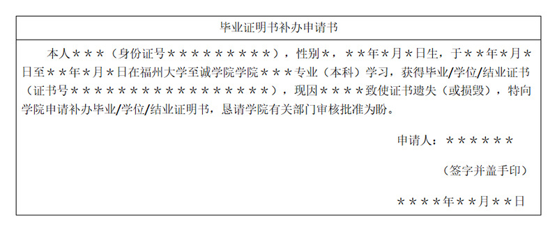 2.遗失者须出示身份证原件,补办学历、学位证明申请书应写明遗失情况,并附个人签字、盖章。参考格式如下: