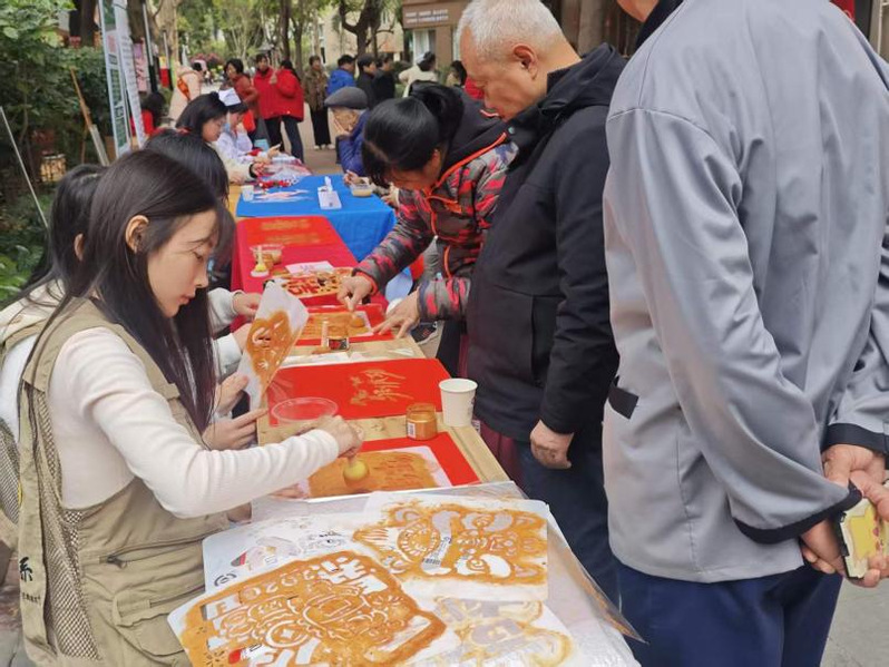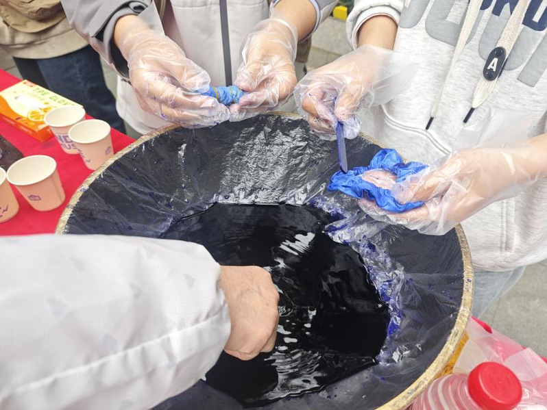 步入活动现场,笑语与温情交织。本次活动的体验区特别设置了扎染与拓印两项非遗手作,让大家一起亲手“染”出心意、“拓”出祝福。在扎染体验区,素白的方巾与各色发圈整齐摆放在桌前,吸引了许多居民驻足体验。大家都积极地参与其中,随着染料的渗透与晕染,每一件作品都呈现出独一无二的纹理。与扎染的随性灵动不同,拓印集福区更多了一份沉静与匠心。从福字到祥云,从传统吉语到现代祝福,同学们在方寸雕版间,亲手将非遗技艺与满满孝心一并“带回家”。活动现场,墨香与欢声笑语交织。志愿者们与社区居民共同体验扎染与拓印的乐趣。志愿者们亲手将现场制作的扎染方巾和拓印福字送到社区老人手中,叮嘱冬日保暖,让暖意从活动中心流淌至社区每个角落。